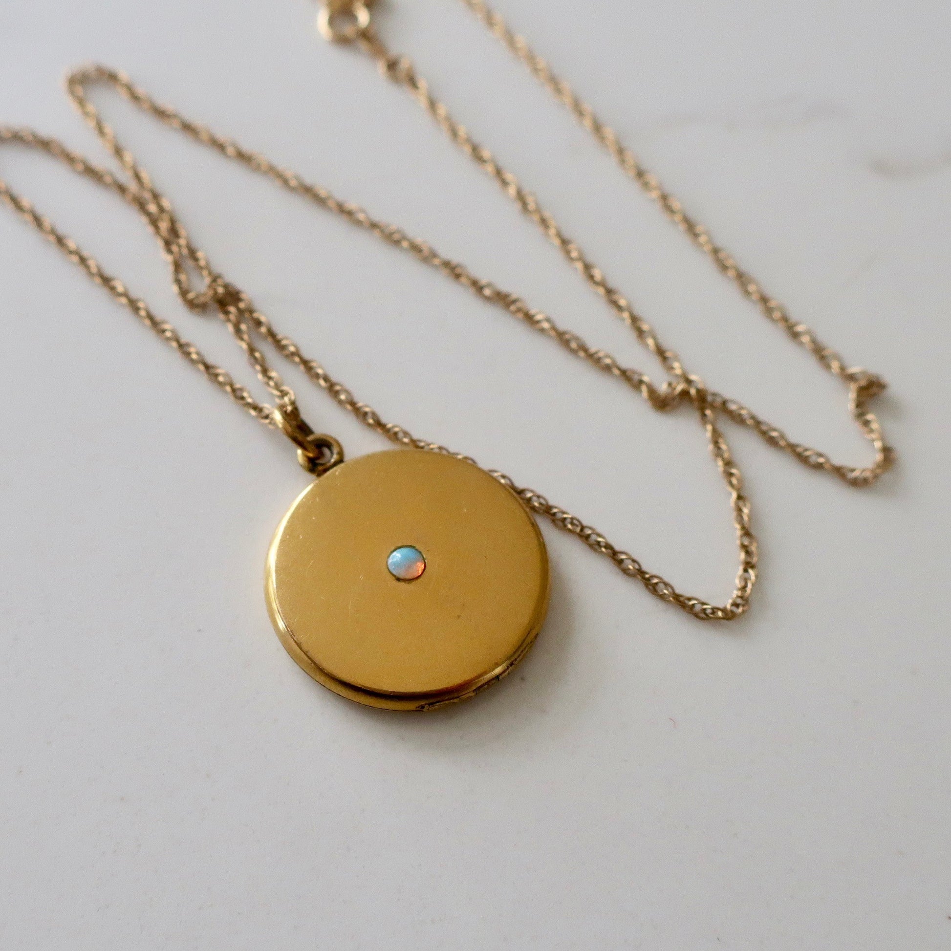 The perfect sized round gold fill locket from circa 1910. Engraved vera in the back this simple locket has a single colorful opal in the center. The locket has all the original frames and plastic covers remaining. The locket hangs on an 18" gold fill chain.