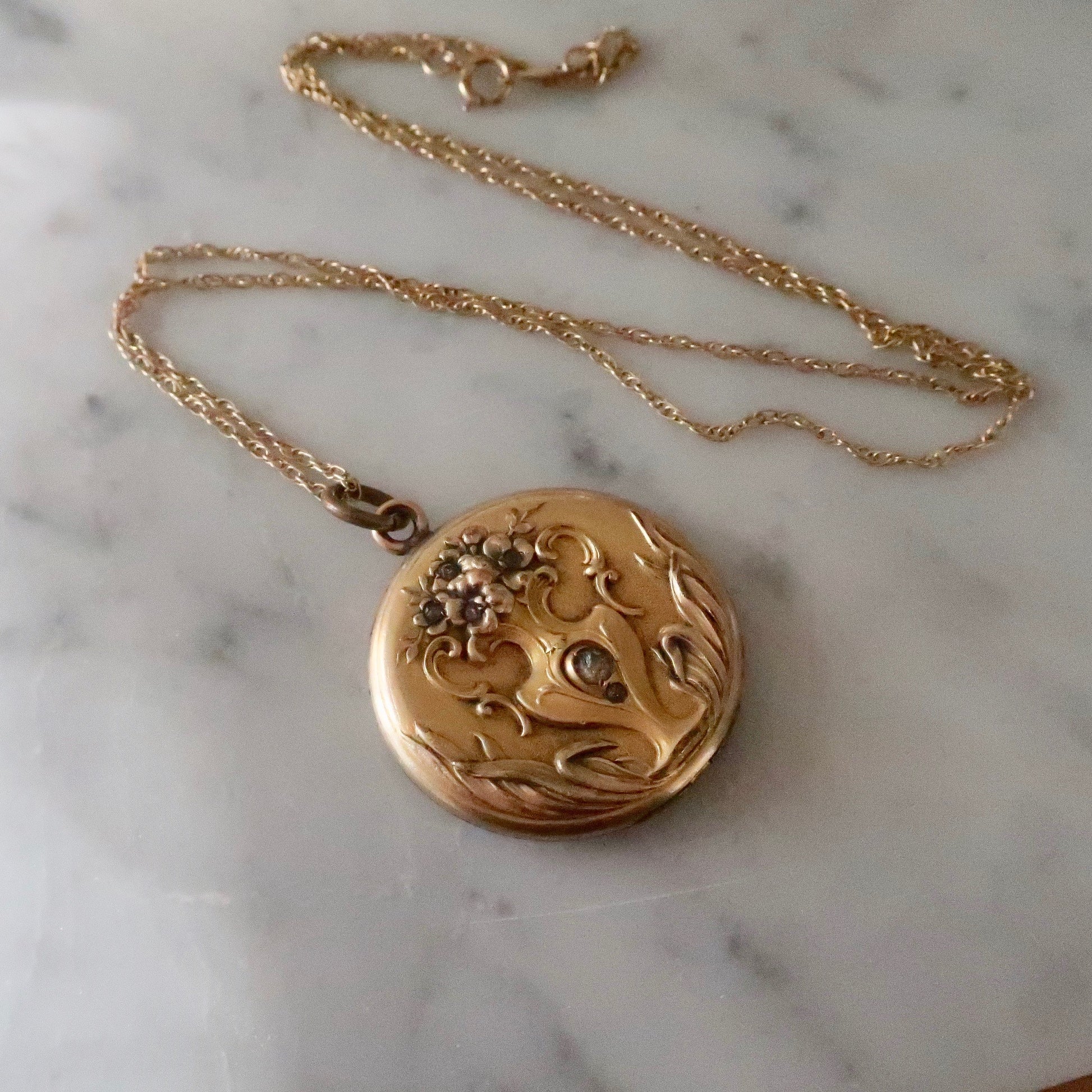 Ornate gold fill Edwardian locket from circa 1910. Featuring an unusual bouquet of old cut paste jeweled flowers with stylized leaves framing the outer edges. Very traditional with Art Nouveau elements that are so classically beautiful. Locket measures just over 1". It has one internal frame remaining. There are initials engraved on the back. Overall the locket is in good vintage condition. It comes on a vintage 18" gold fill chain.