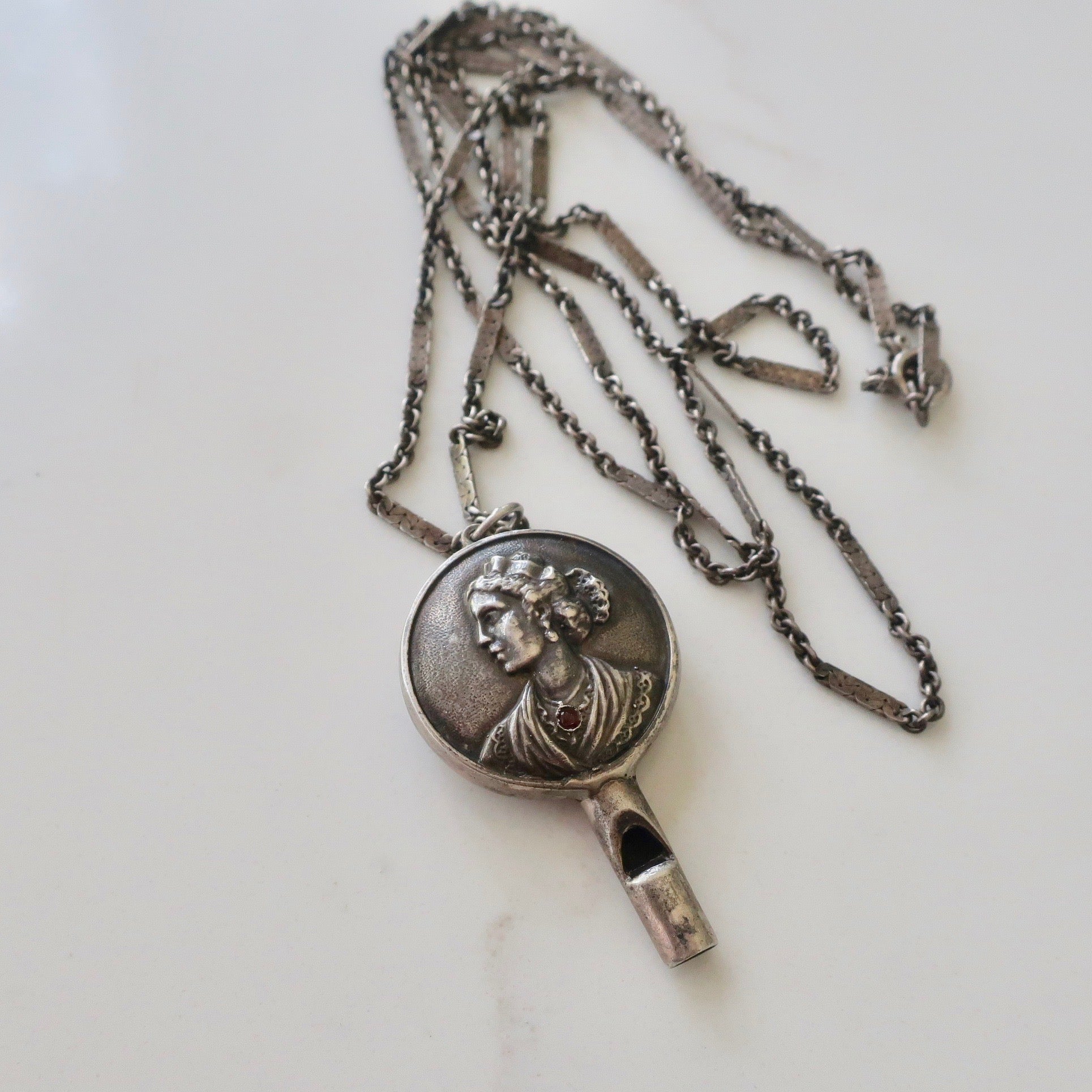 Very rare and unusual whistle pendant from circa 1910. In solid marked sterling this piece features a lovely image of a woman in Edwardian clothes and hairstyle. She has a single bohemian rose cut garnet on her neck. Whistle works and would be used for signaling danger or help as well as possible a dog whistle. I believe this piece to be on it's original chain. Whistle measures 1.3" and the chain measures 30".