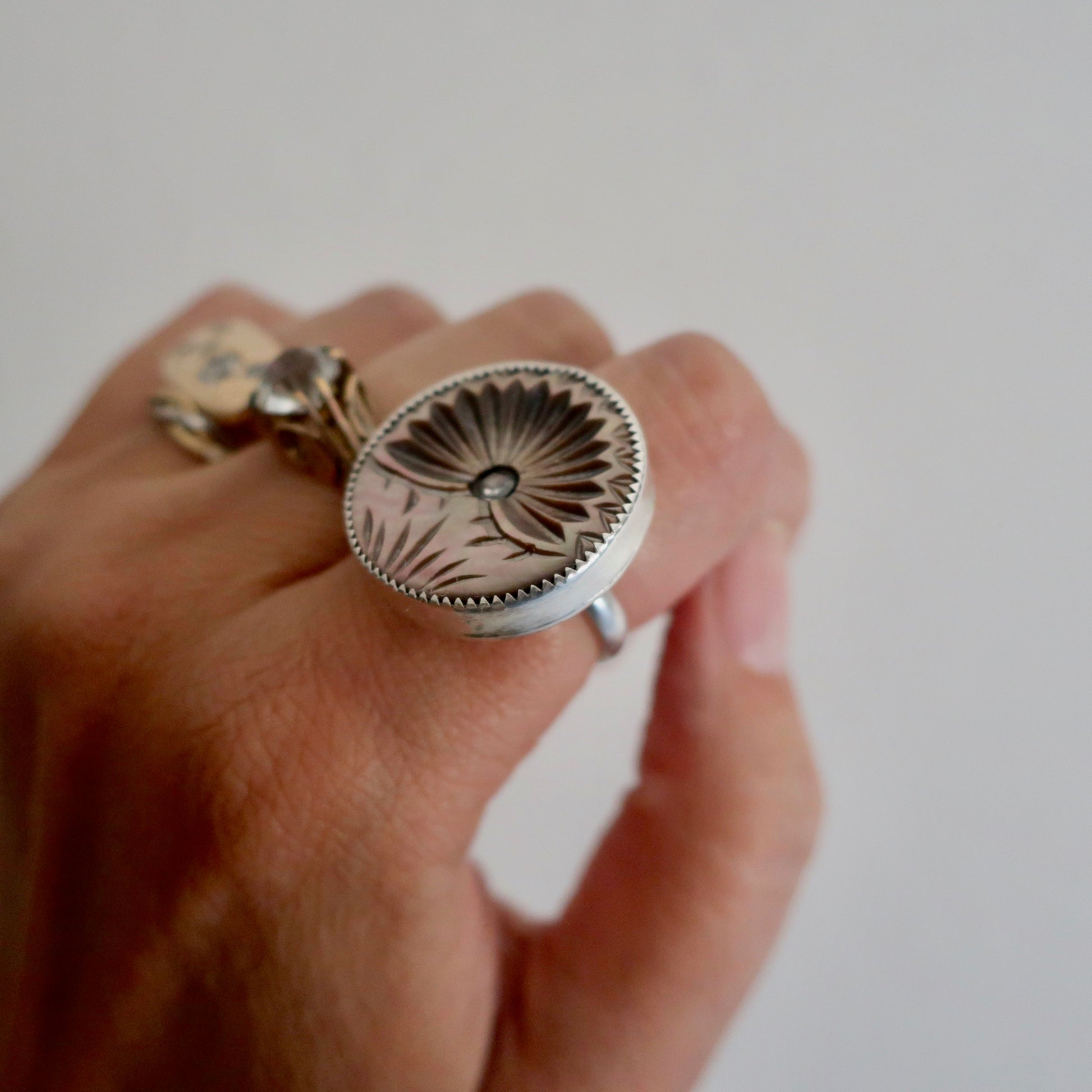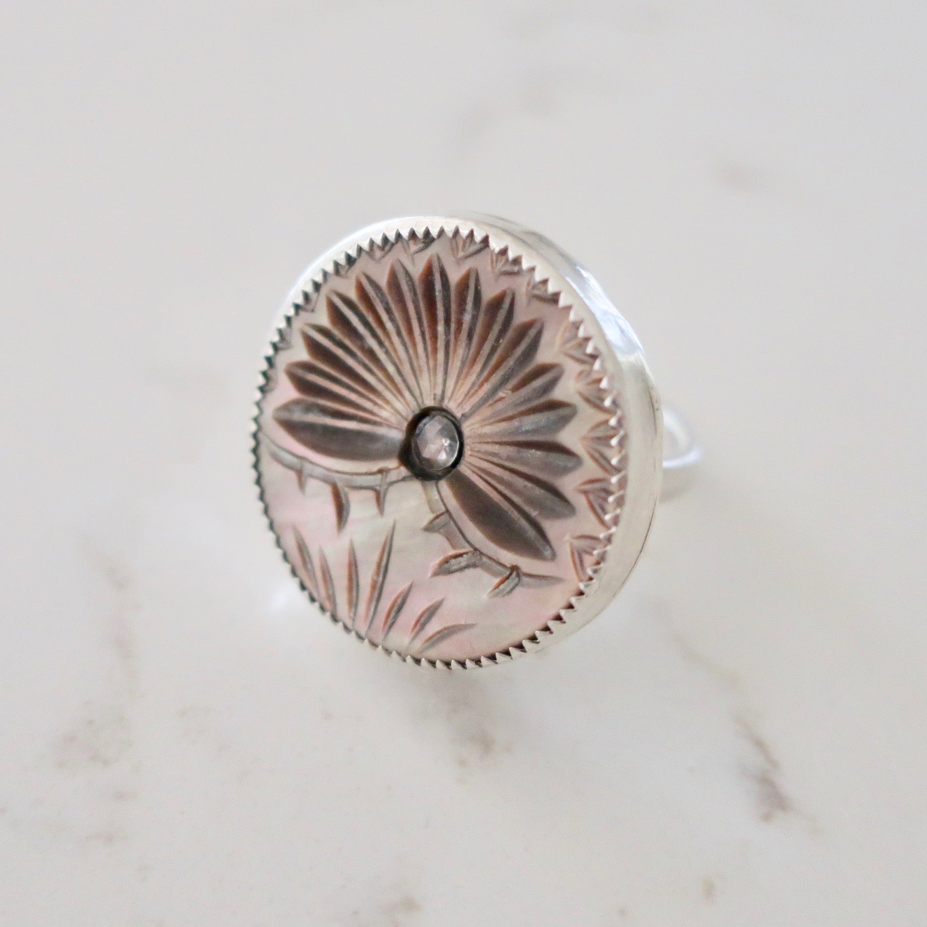 Gorgeous and unique antique button ring with a rose cut moisannite stone. Featuring a hand carved button with a lotus motif made from a pinkish brown mother of pearl. Set in solid sterling this ring is custom made. Button is antique from circa 1890-1900.
