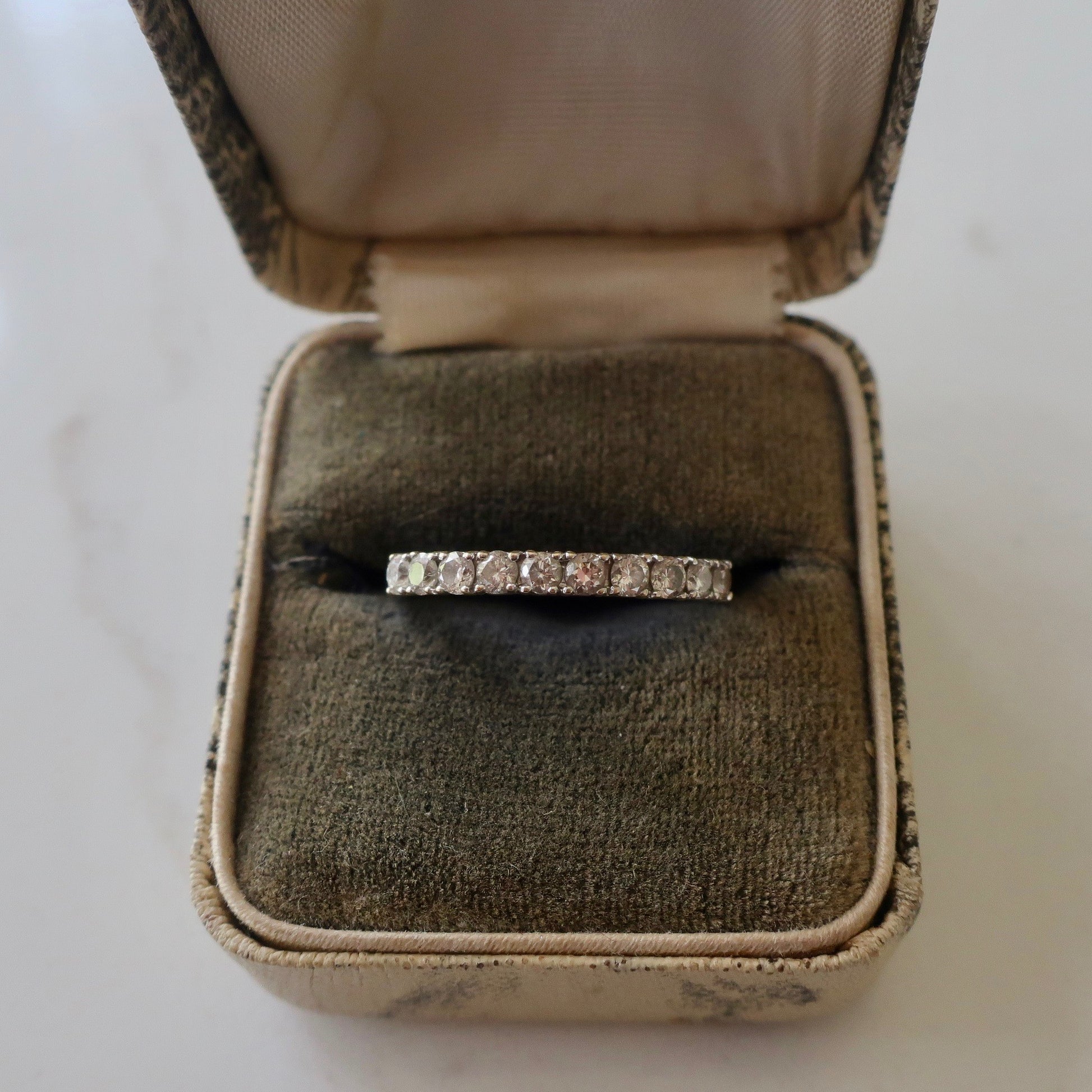 Lovely classic diamond band in 14kt yellow gold. Love the sparkle of this ring. White diamonds lined up without any gold space between the set stones. This ring could be paired with either a yellow gold or white gold ring. aprox 1/2ct diamonds.