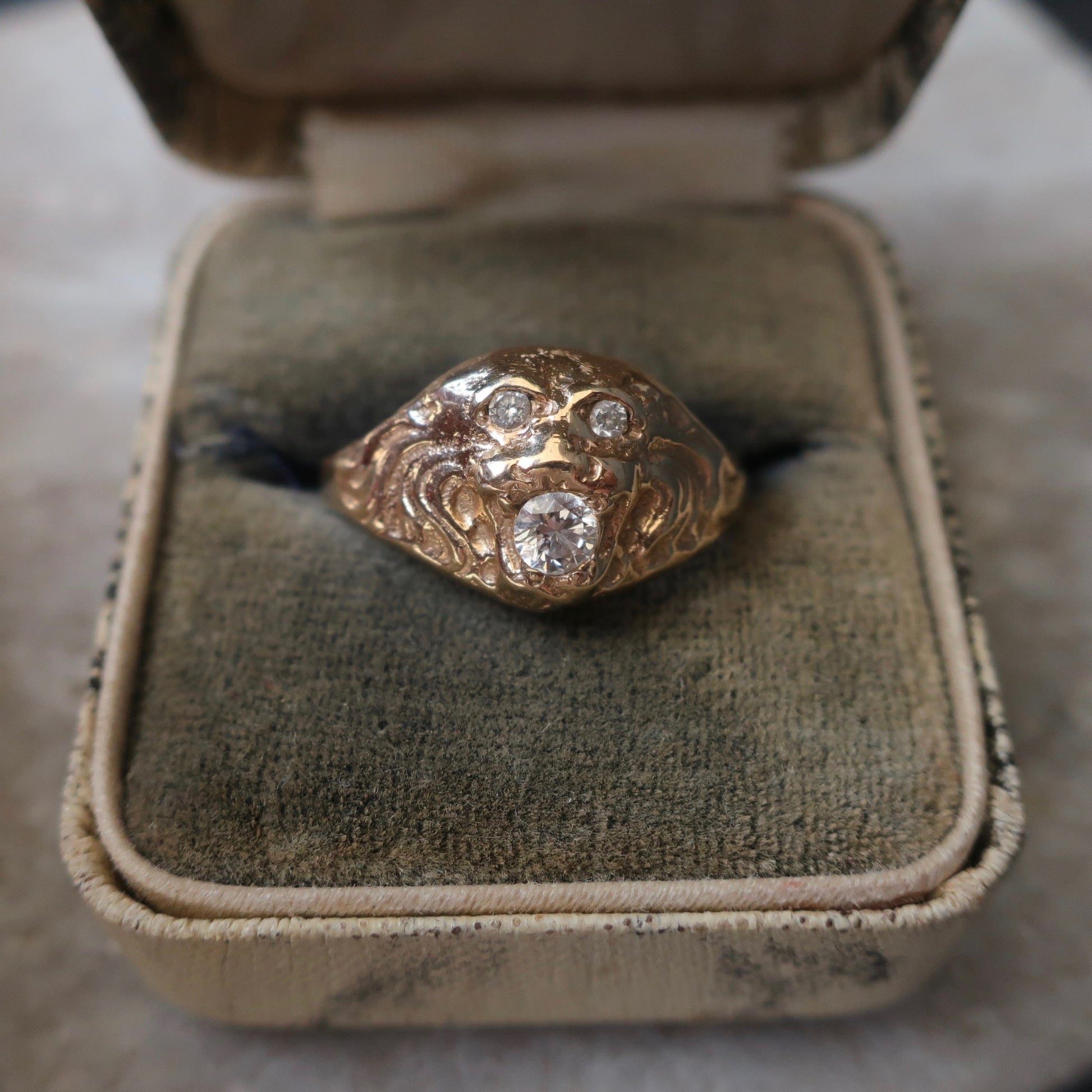 Casted tiger ring made new from a Edwardian Mold. This cute feline friend holds an approx .25ct diamond in his mouth with diamond eyes. Love the low set ring that wraps nicely around the finger. Made with solid 14kt yellow gold.