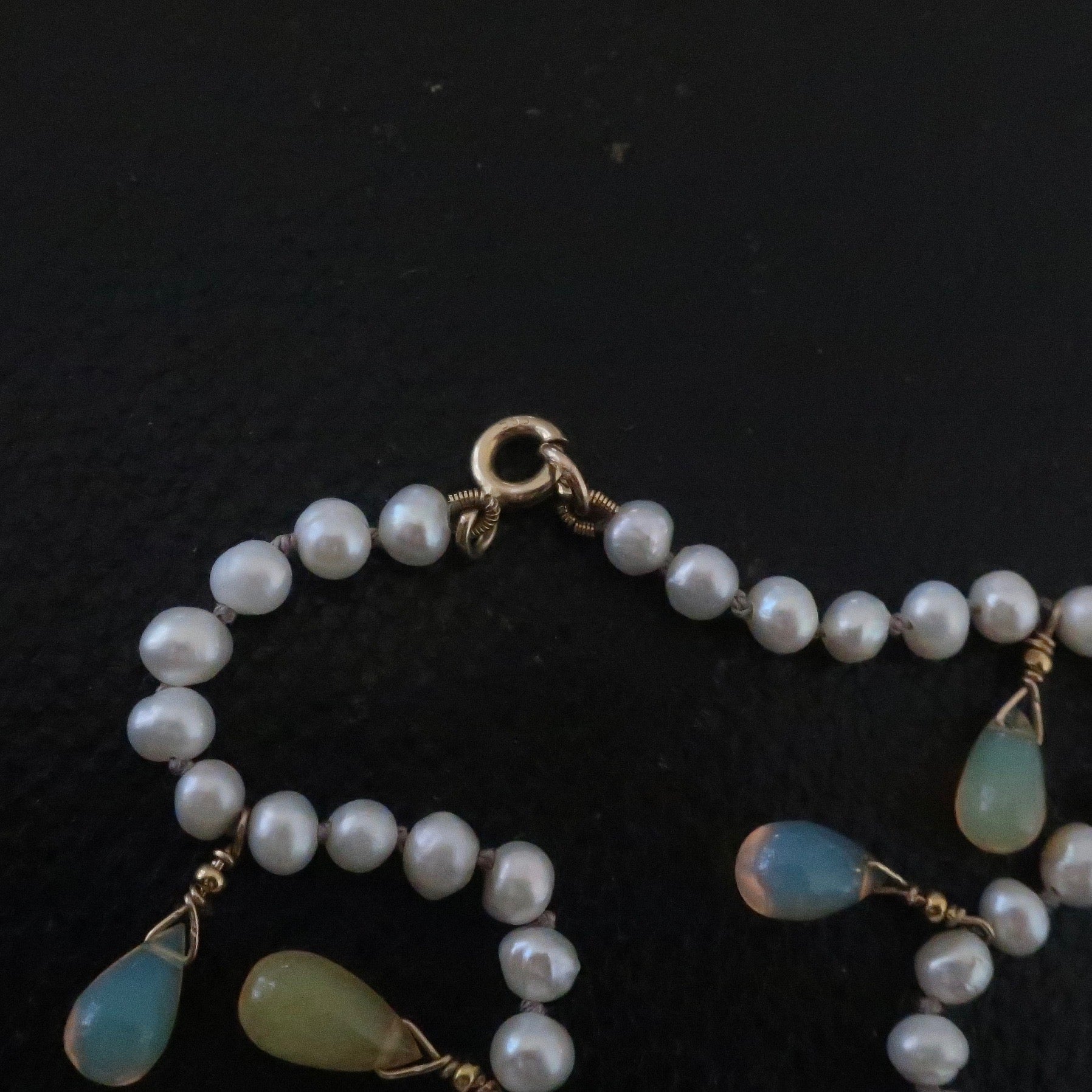 Stunning fresh water pearl and 14kt gold drop opal necklace. Hand knotted and made using beautiful white lustrous fresh water pearls with opal droplets that are on 14kt gold wire. Love the dainty look of this necklace. The clasp and fittings are 14kt gold as well. Currently this necklace measures approx 16" for a close fit. Condition is excellent.