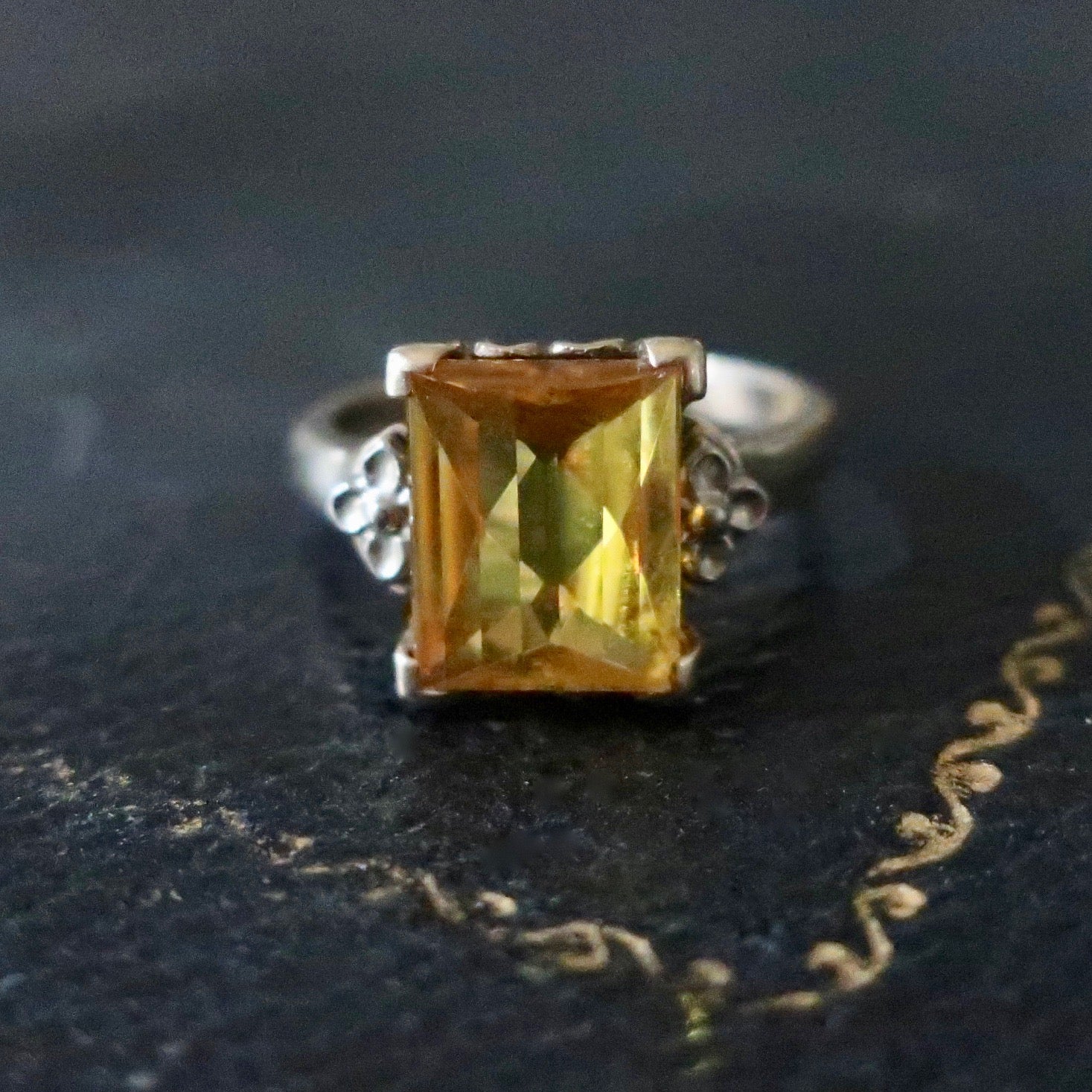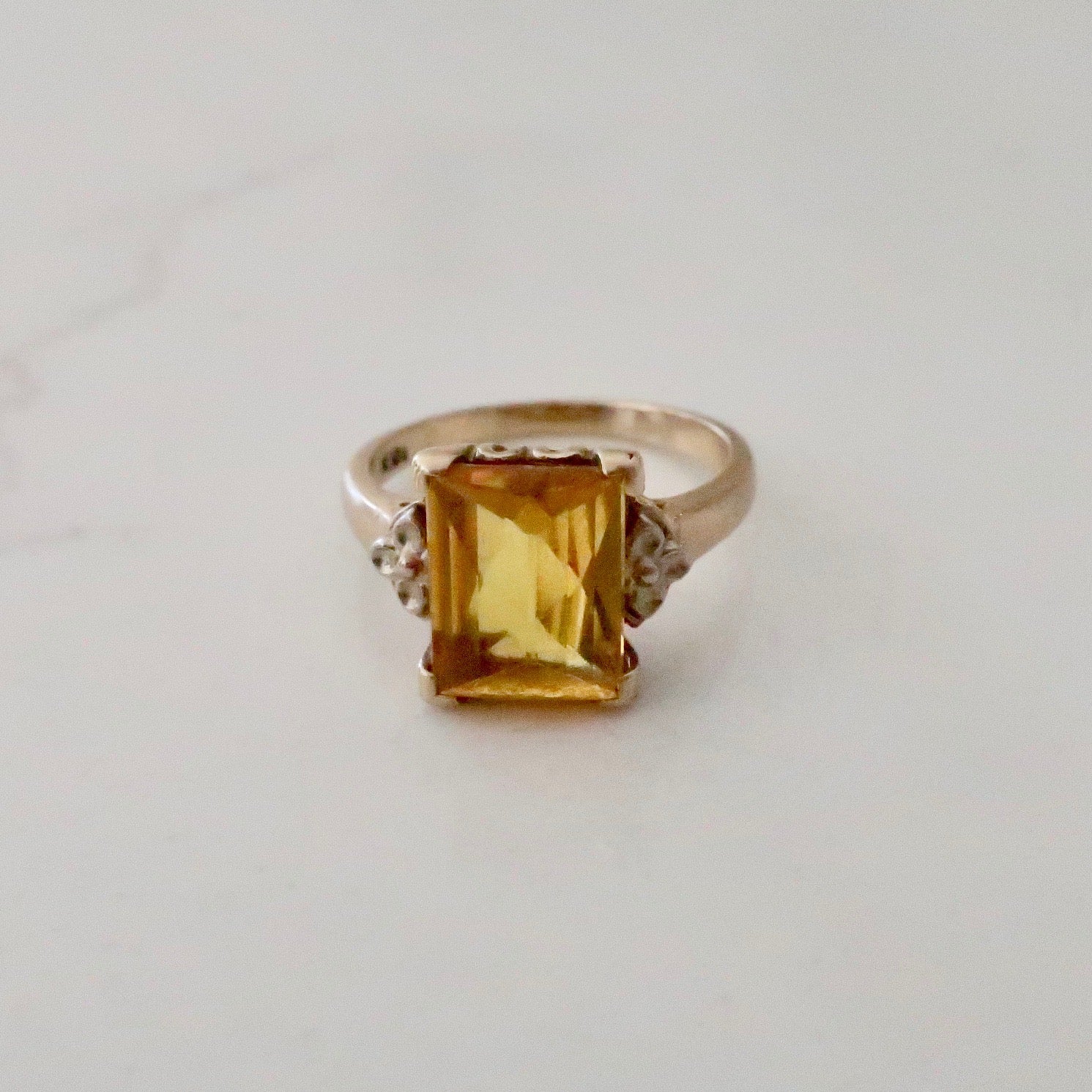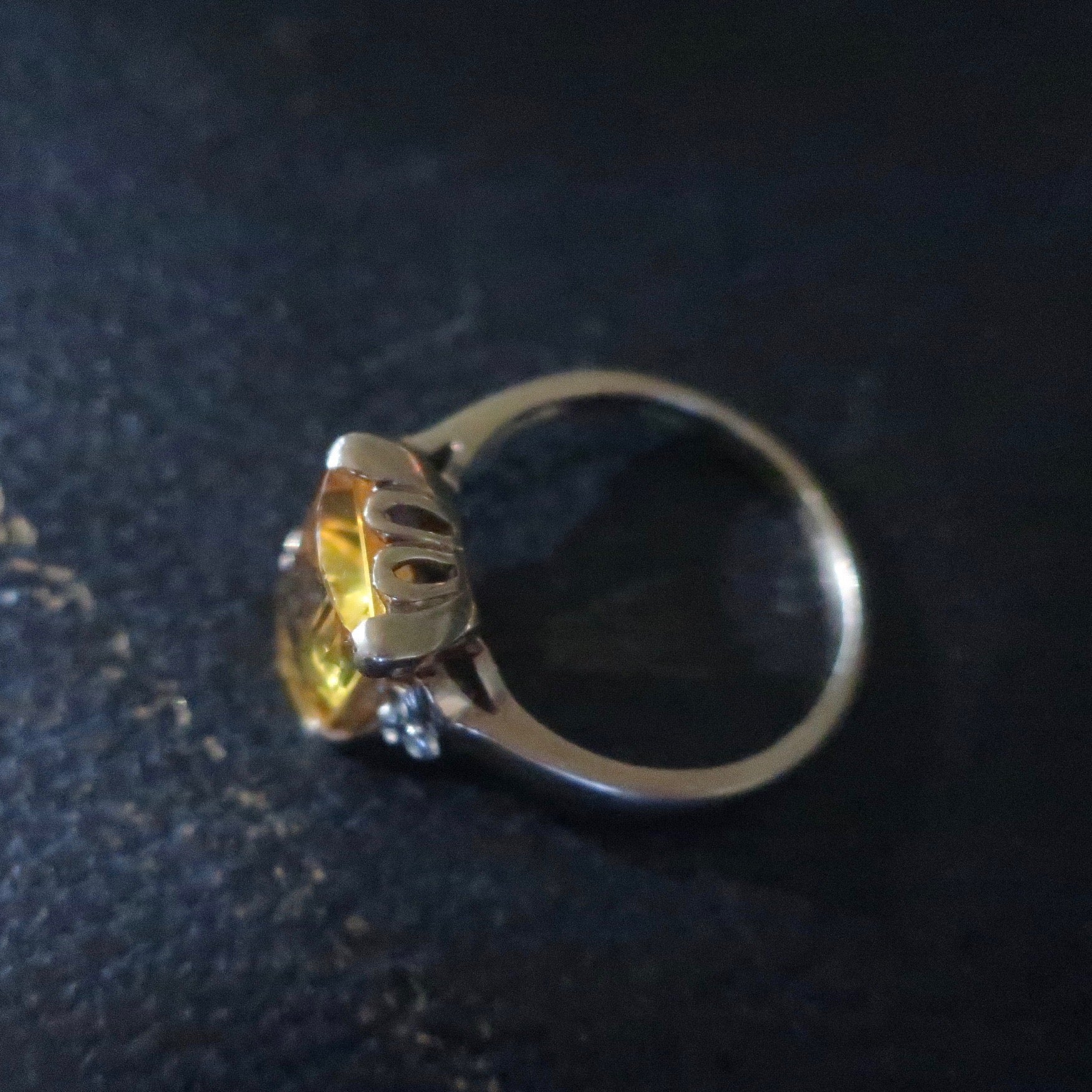 Vintage statement ring from circa 1930-1940. Lovely solid basket setting with two white gold flowers on either side. The Citrine gem is a very unusual cut very deco inspired. The ring is fabricated in solid 10kt yellow gold weighing 3.34 grams.
