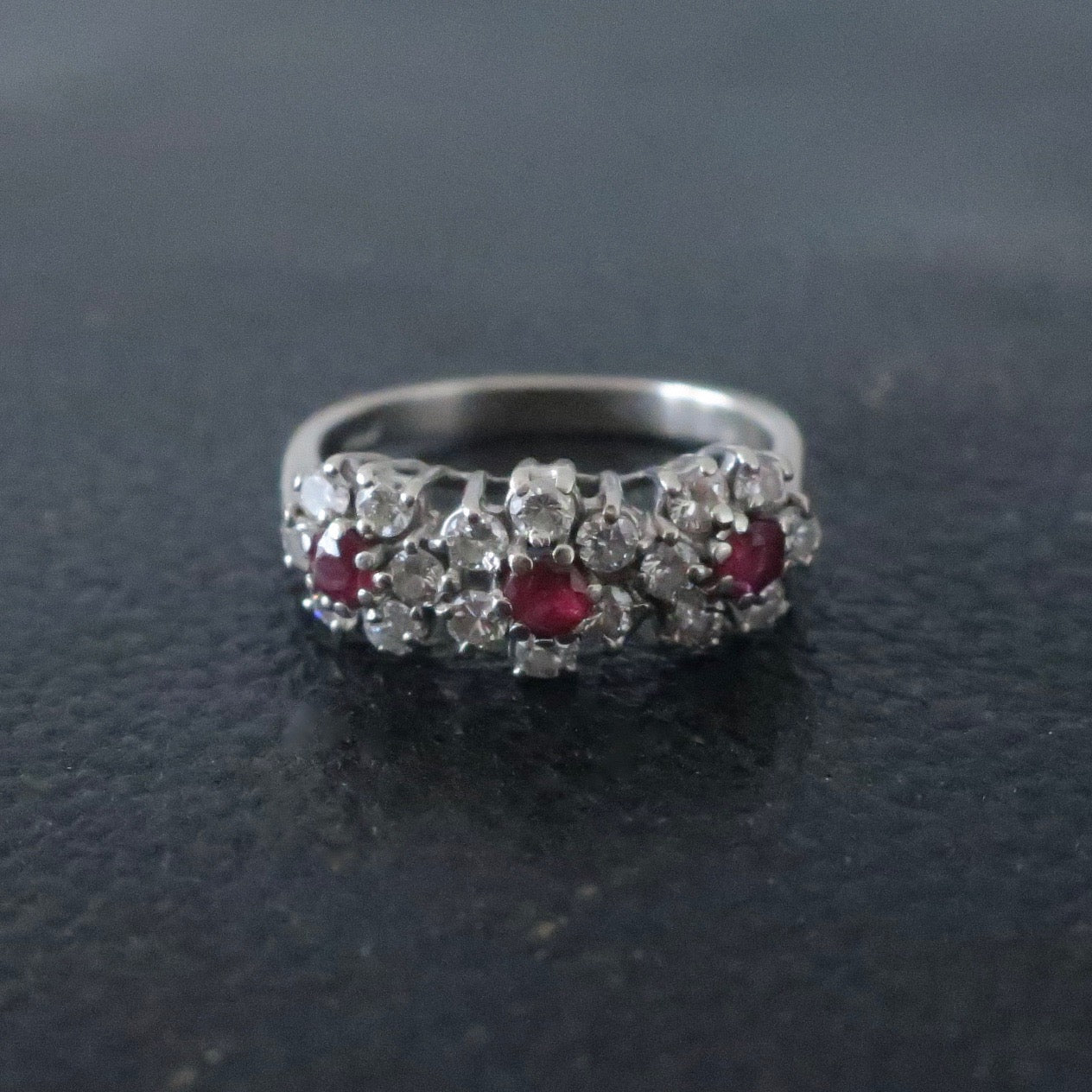 Darling, dainty and sweet vintage diamond and ruby flower band from circa 1960. This band is fabricated in solid 14kt white gold. The ring weighs 3.2 grams and features approx 3/4cts of diamonds. There are additionally 3 deep pink rubies that accent the center of the flowers. Currently a size 5.75 on the ring mandrel but fits almost a size large due to the space underneath the ring. Model's finger is 6.5. Condition of this ring is very good to excellent. Would make a fun unique engagement ring.