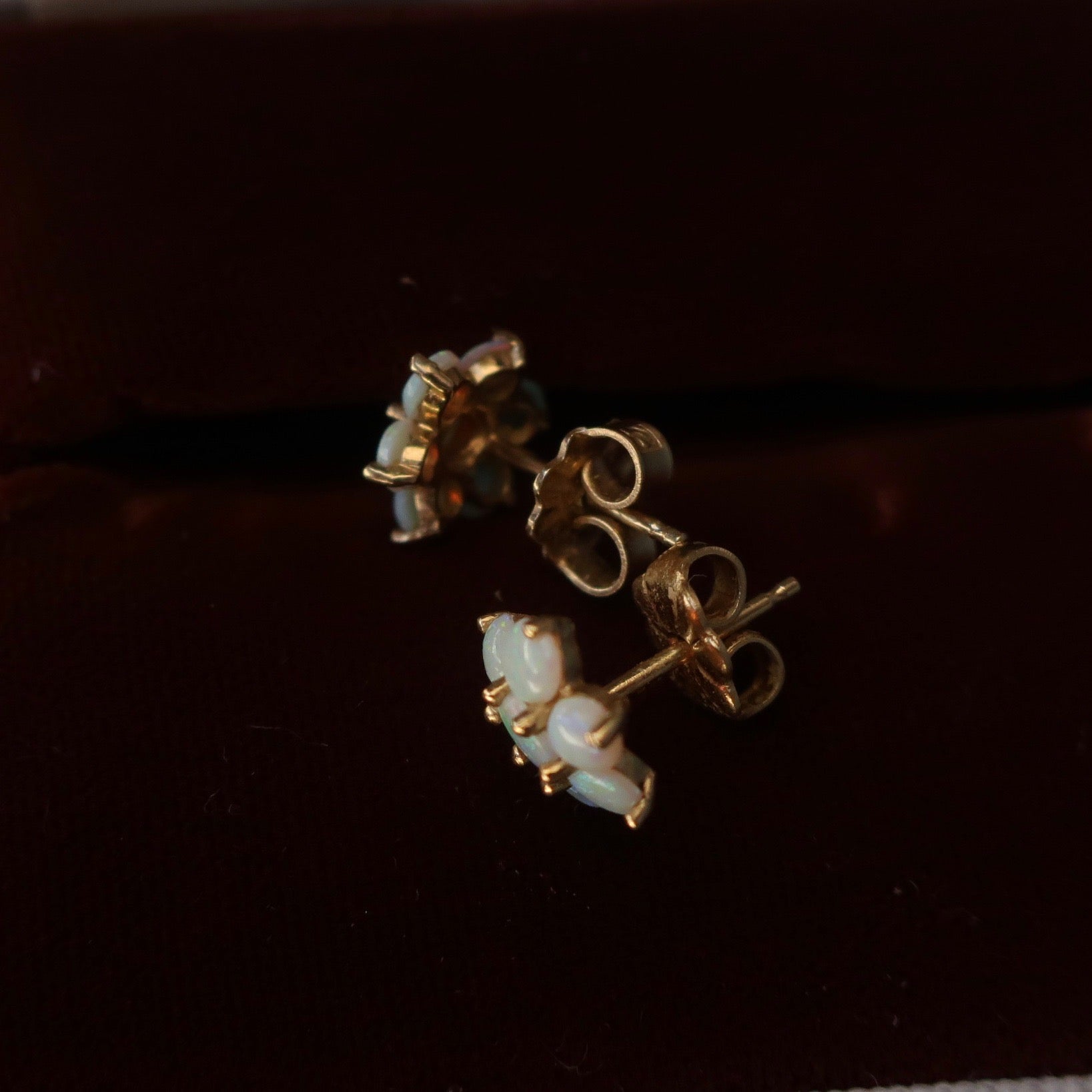 Dainty and lovely these opal earrings are in the pattern of a small flower circa 1990. The opals are very luminous with shimmering s blues, pinks white and green. The earrings are fabricated and marked in 14kt solid gold.