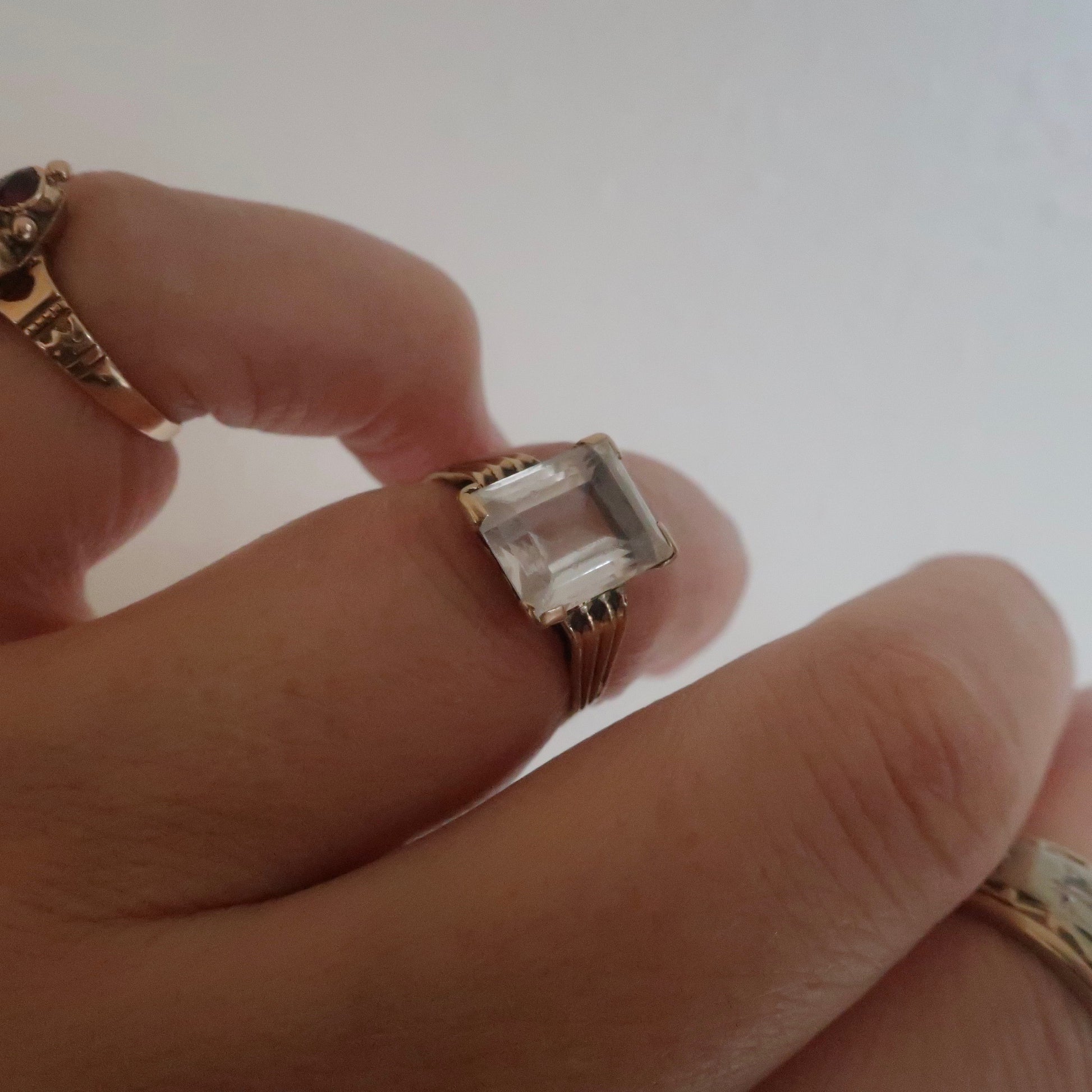 Darling vintage art deco ring from the 1930-1940's. Featuring a lovely emerald cut rock crystal clear stone quartz. Ring is fabricated in a lighter 10kt gold setting Love the style and shape of this angular ring. Currently this ring is a size 5.75 but fits close to a size 6. Condition is good, this ring is light weight and thin but was made to be so.