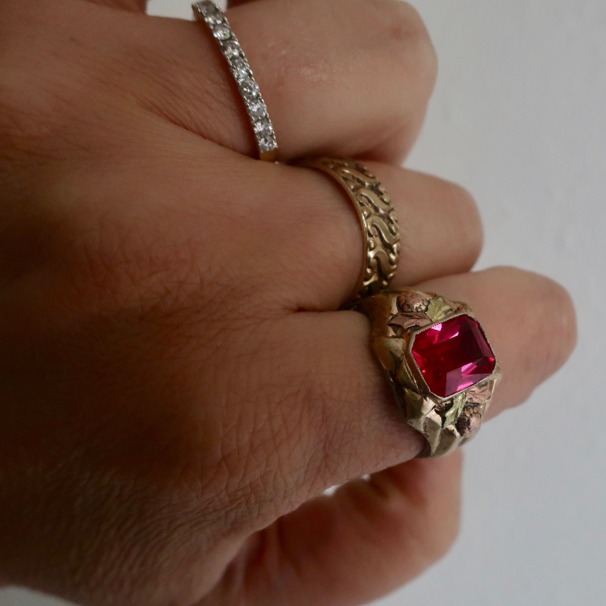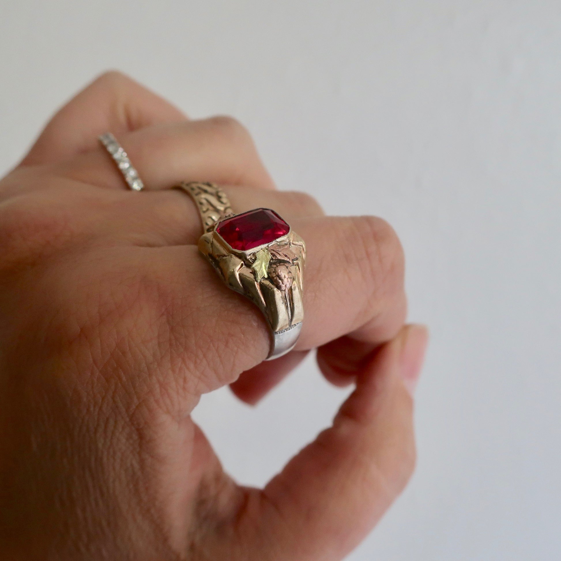 Outstandingly retro vintage ruby statement ring from circa 1930. This ring's base is sterling with 10kt overlay on the front with three colors of gold. Nice foilage surrounds a substantial lab ruby. Ring is marked for both sterling and 10kt gold.