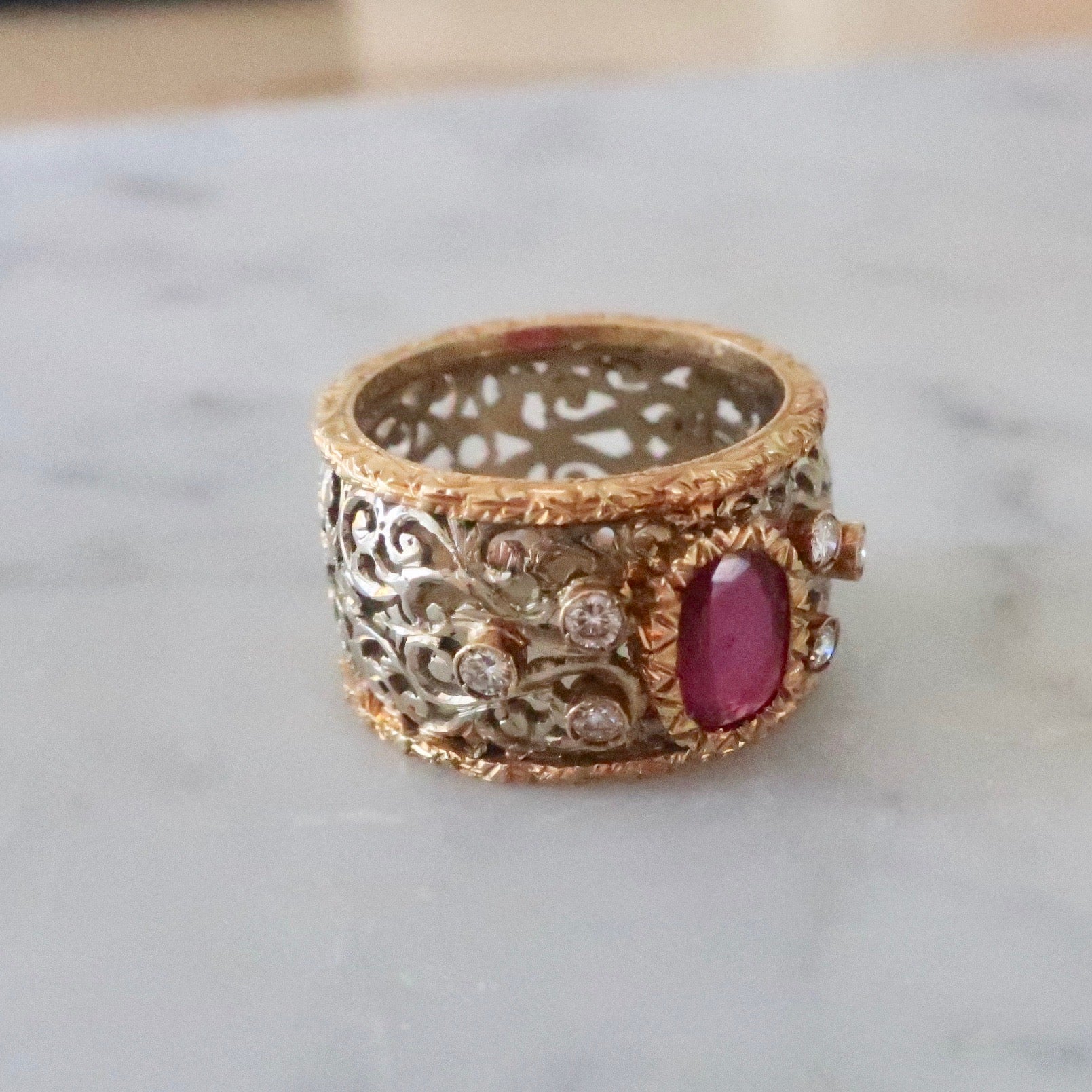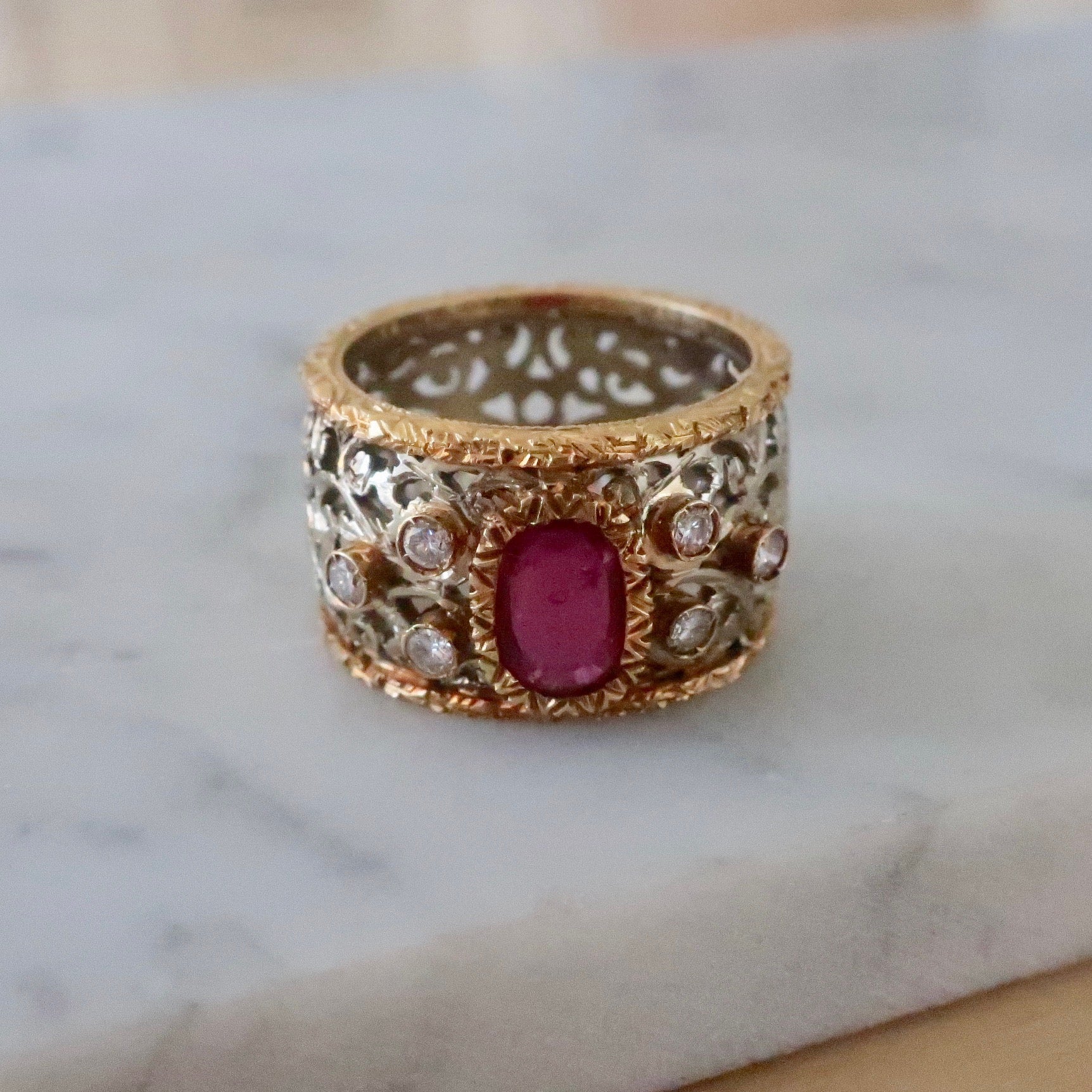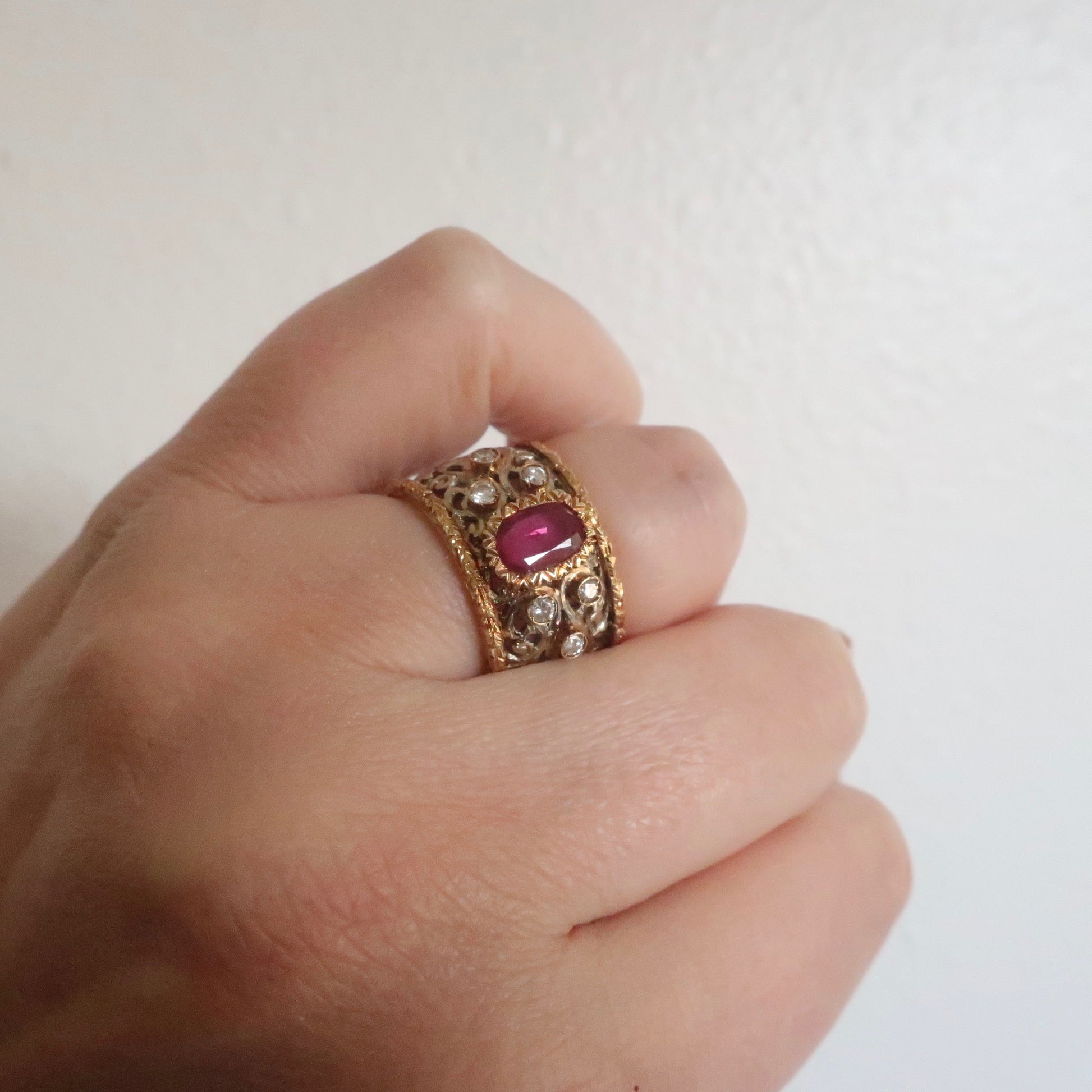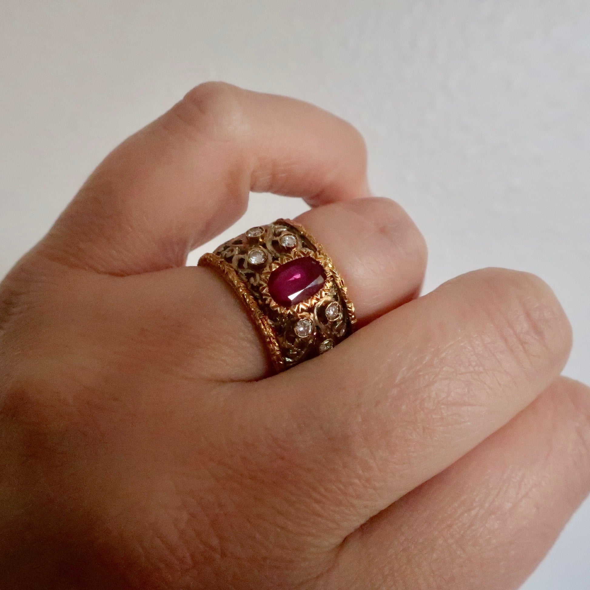 Vintage Wide Band 14kt Gold Ruby and Diamond Ring